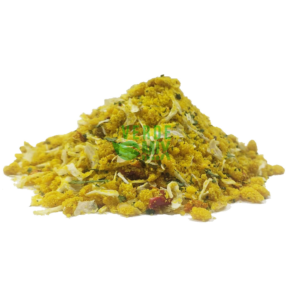 Ingredientes: cebola desidratada, alho natural, salsa desidratada, tomate desidratada, manjericão, açafrão, realçador de sabor galinha.