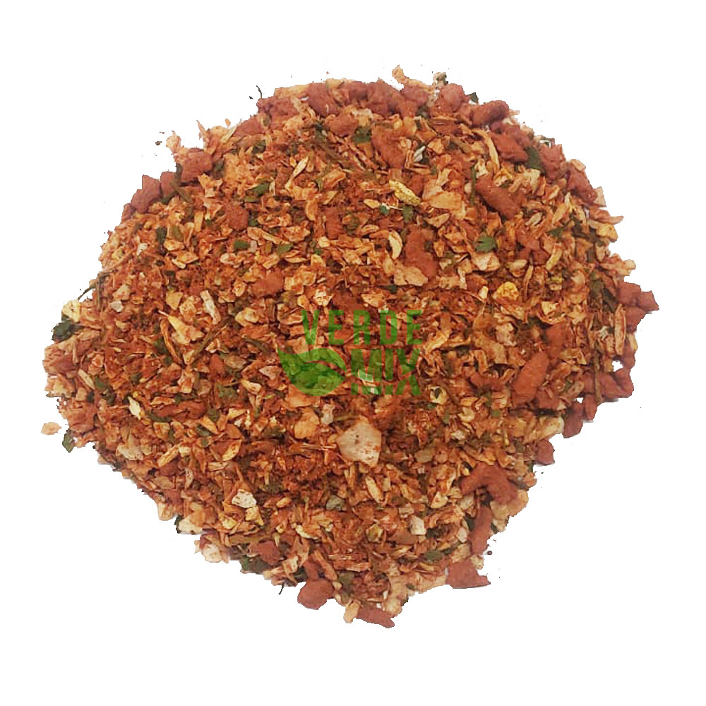 Ingredientes: Cebola desidratada, proteina de soja texturizada sabor bacon, salsa desidratada, realçador de sabor glutamato monossódico.